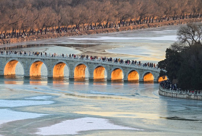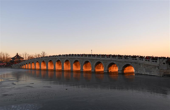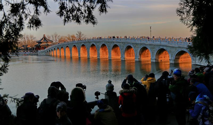 12月21日是冬至气节,北京颐和园十七孔桥的“金光穿洞”景不雅迷惑了繁多旅客与照相醉心者不雅赏拍摄。